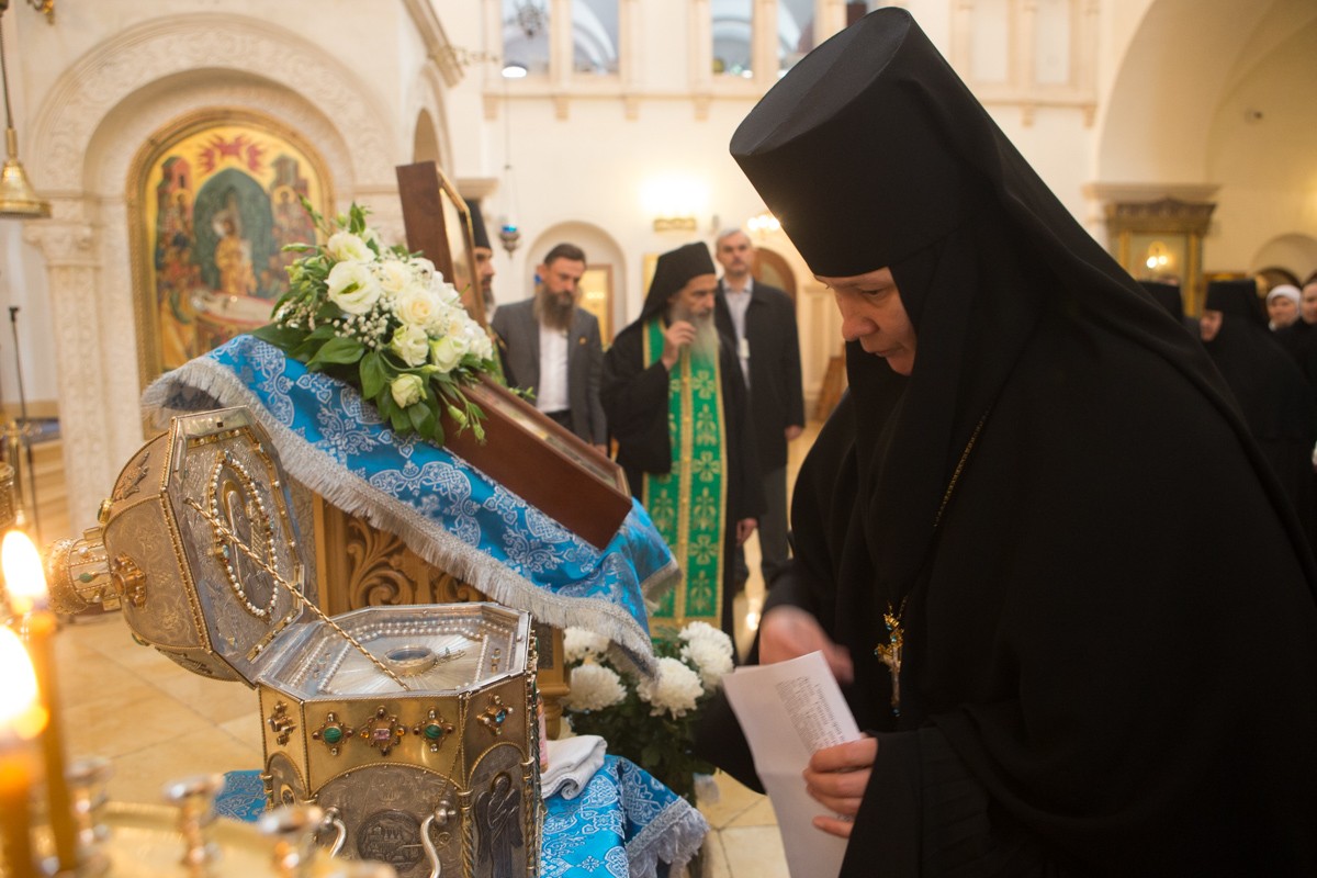 У Святых врат обители святые мощи торжественно встретили заместитель председателя Синодального отдела по монастырям и монашеству, настоятельница Зачатьевского ставропигиального женского монастыря игумения Иулиания (Каледа) с сестрами; настоятельница Свято-Елисаветинского женского монастыря Русской Православной Церкви Заграницей г. Мюнхена (Германия) игумения Мария (Сидоропулу); настоятельница монастыря Св. прпмц. Параскевы (о. Корфу, Греция) игумения Фотиния (Маршалл).