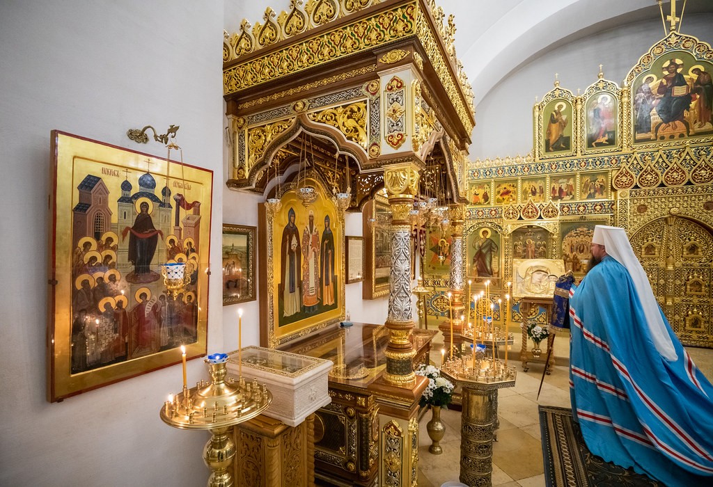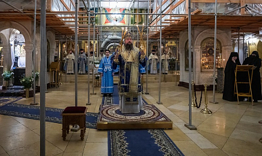 Его Высокопреосвященству сослужили протопресвитер Владимир Диваков, секретарь Патриарха Московского и всея Руси по г. Москве, настоятель храма Святой Троицы на Грязех протоиерей Иоанн Каледа и духовенство обители.