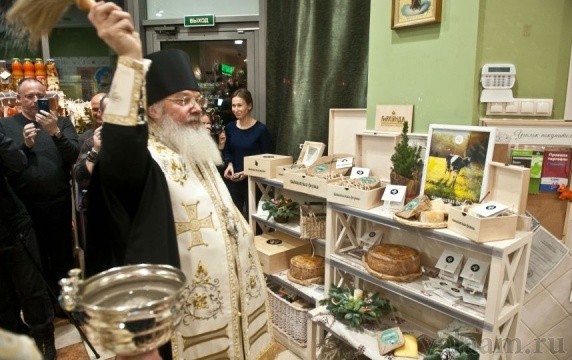 Открытие прилавка для валаамских сыров, представленных в фермерском магазине, приехал освятить игумен Спасо-Преображенского Валаамского монастыря епископ Троицкий Панкратий: