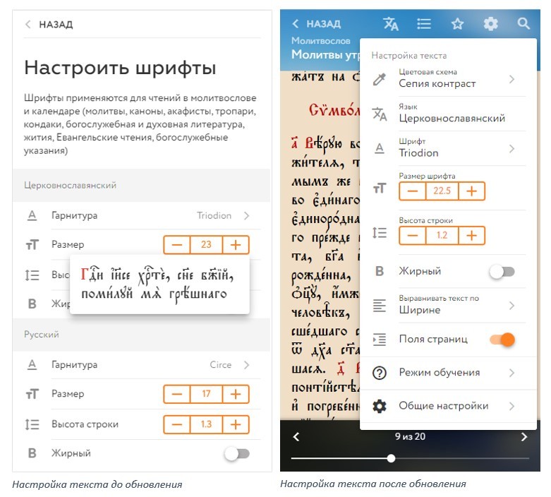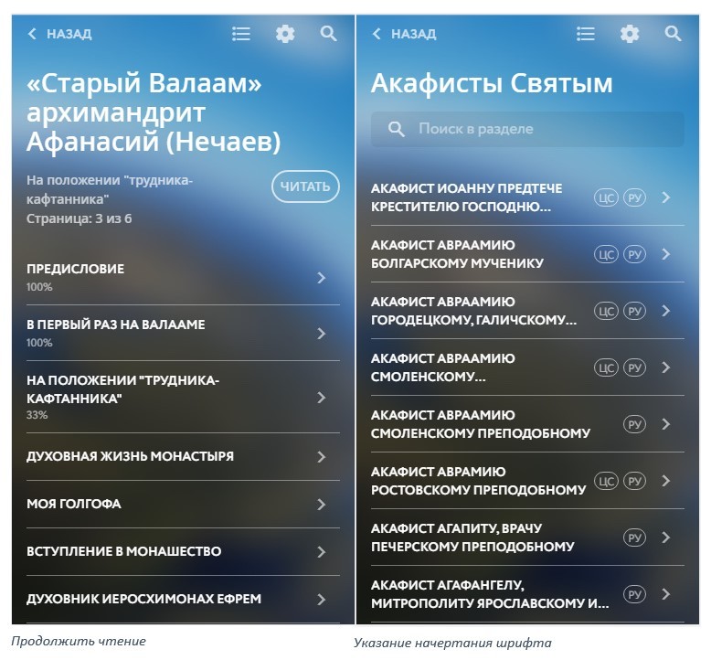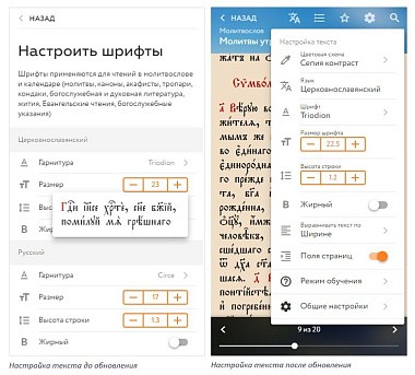 В приложение было добавлено запоминание последнего места чтения: теперь, читая, к примеру, длинный канон, расширенное житие святого или книгу, можно прерваться и продолжить позже с того же места.