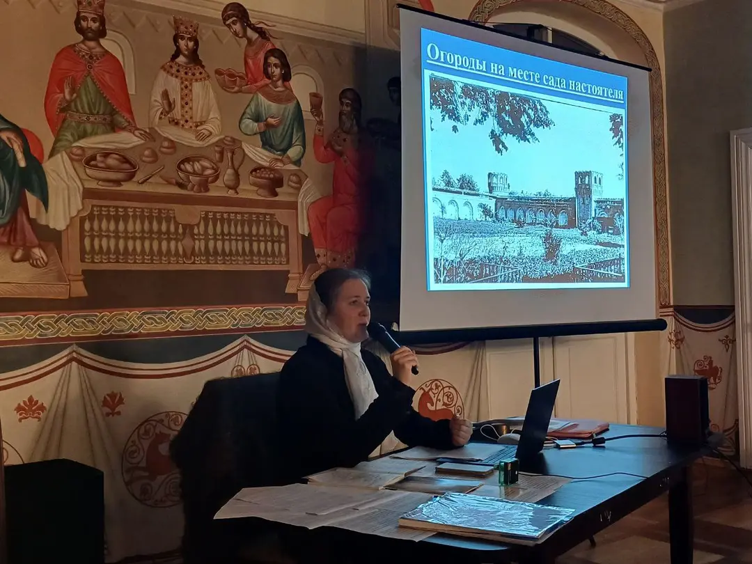 Встречу провела историк, член Союза краеведов России, лауреат Макариевской премии по гуманитарным наукам 2023 года М.В. Артюшенко. Она представила доклад, первая часть которого была посвящена внутренней жизни Донского монастыря в послереволюционные годы, вторая часть – судьбам репрессированных настоятелей и братии Донского монастыря.