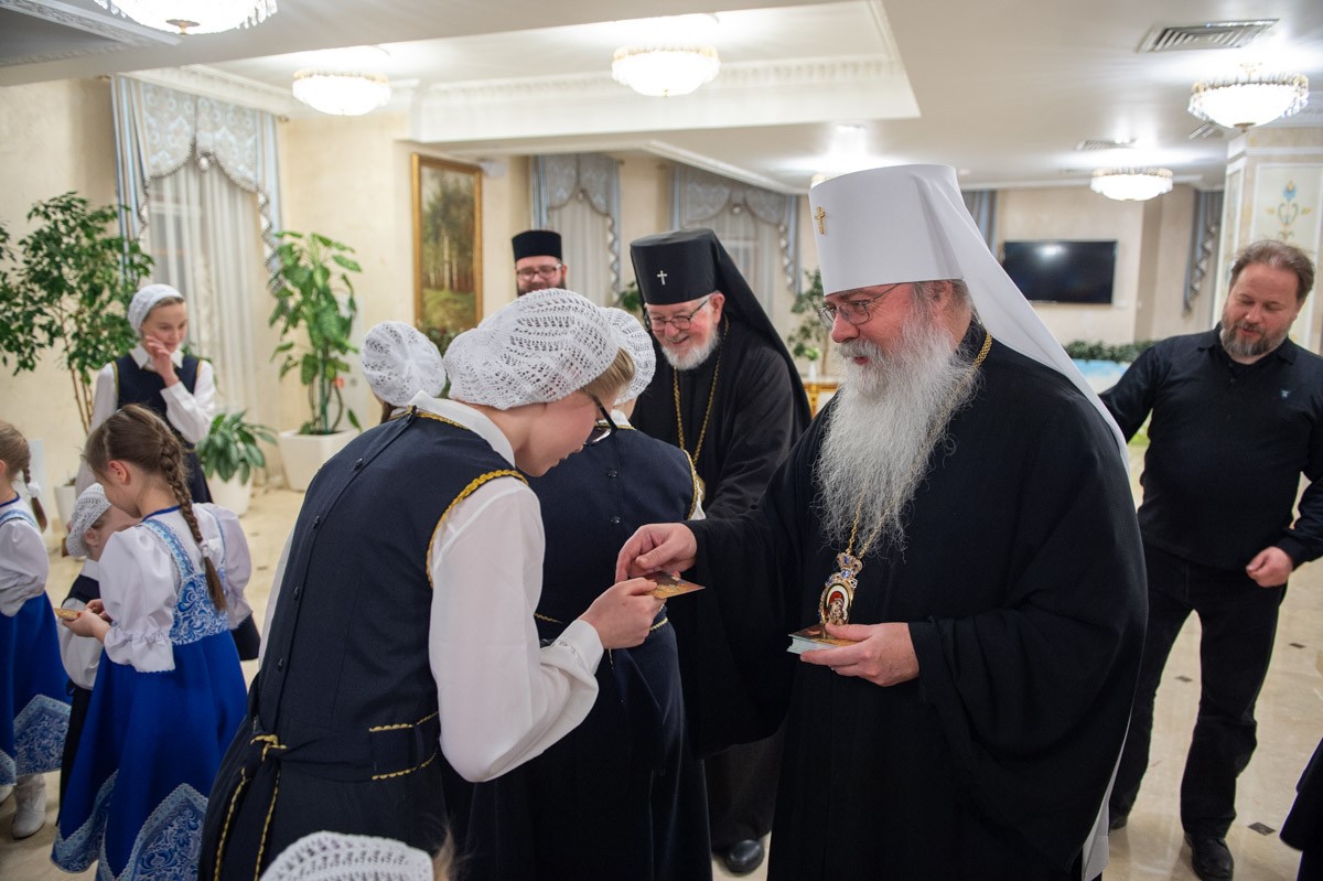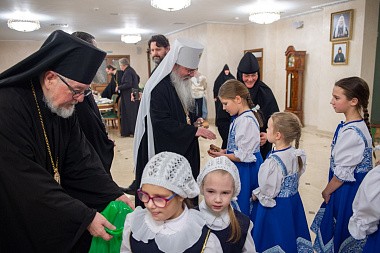 В память о посещении обители игумения Феофания преподнесла в дар Блаженнейшему владыке святую панагию и кадило, а всем членам делегации – памятные подарки.