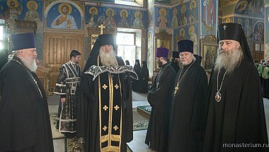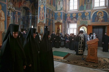 По окончании богослужения игумения Олимпиада приветствовала Предстоятеля Русской Православной Церкви и преподнесла Его Святейшеству крест и покровцы.