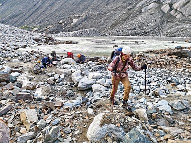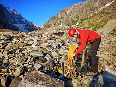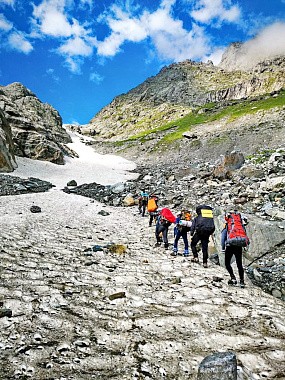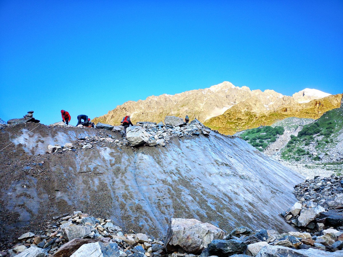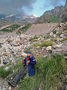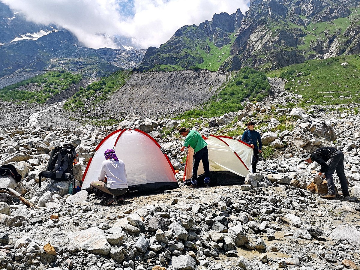 Намеченные ранее планы пришлось менять. Хотели провести тренировку на нижней ступени ледопада Цейского ледника, но, подойдя к заваленным глыбами местам предполагаемых занятий, от идеи отказались. Намечали подняться на знаковую гору – пик Николаева, – но, увидев, в каком состоянии маршрут, решили отклонить и этот вариант. В данной ситуации «на помощь» пришел «обкатанный» пик Черевиченко. Хотя и этот маршрут, уже пройденный и знакомый, преподнес свои небольшие сюрпризы: тропа, которая вела к началу подъема, проложенная между каменных склонов, во многих местах стала труднопроходимой. Участки дороги, проложенные в свое время по плоскогорью, заросли травой по пояс, двигаться вверх с тяжелыми рюкзаками за спиной было сложно даже взрослым участникам экспедиции. Однако тяготы и лишения лишь подтвердили хорошую готовность группы, сплоченность коллектива, а также морально-волевую устойчивость ребят, их умение быстро перестраиваться в новых условиях. Предлагерная подготовка, которая велась в течение всего учебного периода, стала надежной основой для занятий в горах.