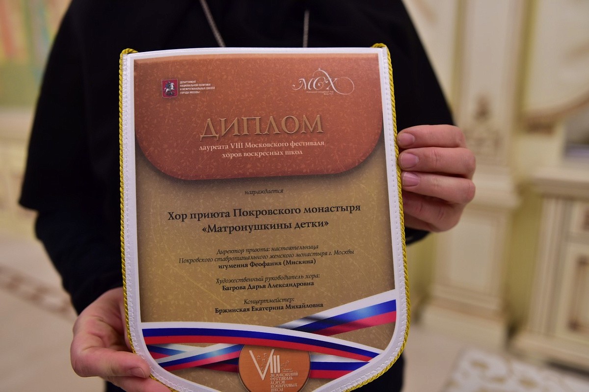 хор приюта Покровского ставропигиального женского монастыря «Матронушкины детки» исполнил произведения: «Гляжу в озера синие» (музыка – И. Дунаевский, слова – М. Матусовский), «Песня о России» (музыка – В. Локтев, слова – О. Высотская);