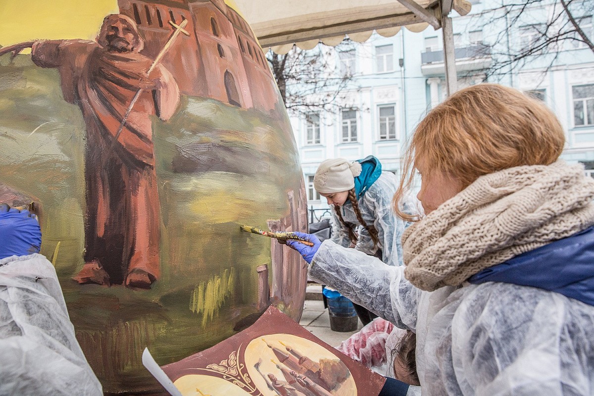 Вдоль главной аллеи Страстного бульвара растянулась вереница шатров, под каждым из которых в течение двух часов работали школьники, расписывая большие двухметровые макеты яиц. На роспись этих 20 яиц ушло 300 литров краски и 600 кисточек и валиков.