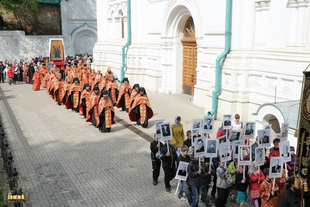 Во время шествия крестного хода исполнялись Пасхальные песнопения и служился молебен с акафистом Божией Матери перед иконой «Нерушимая Стена», символично выбранной для этого крестного хода, которую могли понести все желающие. И их было немало: люди с благоговением по очереди приступали к помосту, на котором несли икону Пречистой. Замечательной особенностью крестного хода стало то, что впереди него, за братией, что несла хоругви, шли дети и в своих руках, подобно хоругвям, несли фотографии ветеранов Великой Отечественной войны, принимавших участие в боях за Святогорье, а также тех, кто был родом из этих мест, назвав их символически «Бессмертный полк Святогорья». Участники шествия приветствовали всех радостными пасхальными возгласами «Христос воскресе!» и поздравляли с праздником Победы.