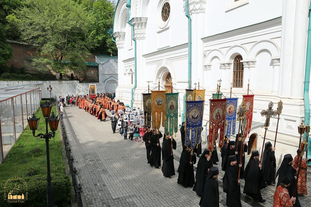 По окончании Божественной литургии состоялся крестный ход, который возглавил наместник Лавры архиепископ Святогорский Арсений. Начался он от Успенского собора обители и завершился на горе Артема у мемориального комплекса – братской могилы воинов, павших в сражениях за освобождение Святых Гор от фашистских захватчиков.