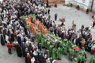 По окончании Литургии состоялся крестный ход, во время которого мощи преподобного Амфилохия были перенесены из Спасо-Преображенского собора в Пещерную церковь, где они пребывают вместе с мощами преподобного Иова, игумена и чудотворца Почаевского.