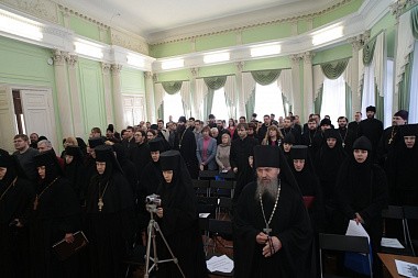 Заместитель Председателя Синодального отдела по монастырям и монашеству, настоятельница Зачатьевского ставропигиального женского монастыря в Москве игумения Иулиания (Каледа) передала присутствующим благословение Председателя Отдела архиепископа Сергиево-Посадского Феогноста и выразила благодарность за возможность принять участие в этом мероприятии. В своем докладе игумения Иулиания осветила проблемы современного монашества.