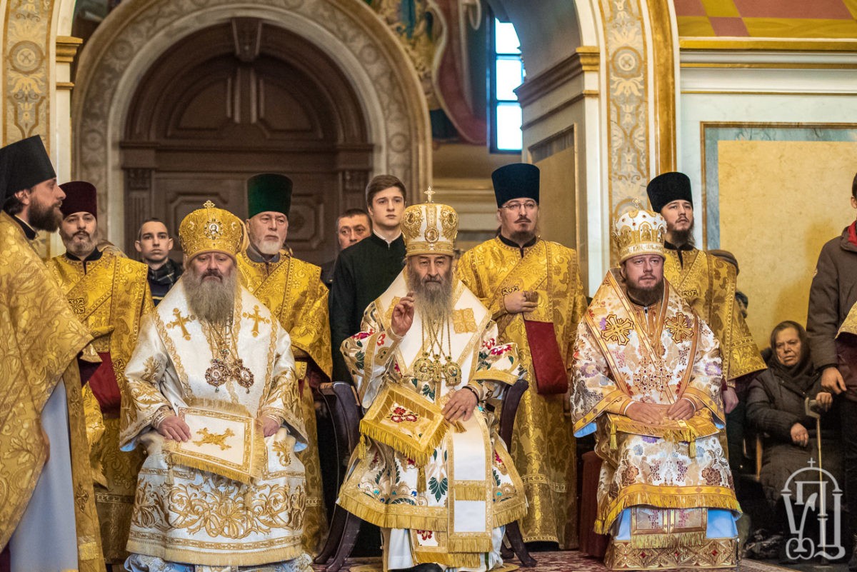 Предстоятелю УПЦ сослужили наместник Киево-Печерской лавры митрополит Вышгородский и Чернобыльский Павел, епископ Житомирский Виктор, епископ Бородянский Марк и духовенство обители.