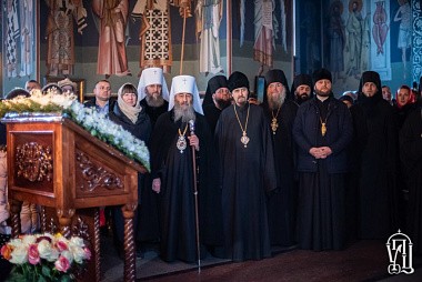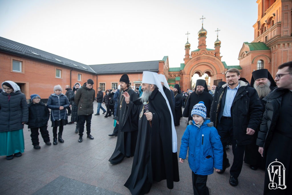 Блаженнейшего владыку сопровождали управляющий делами Украинской Православной Церкви митрополит Бориспольский и Броварской Антоний, наместник обители епископ Ворзельский Исаакий, епископ Белогородский Сильвестр, епископ Переяслав-Хмельницкий Дионисий.