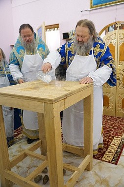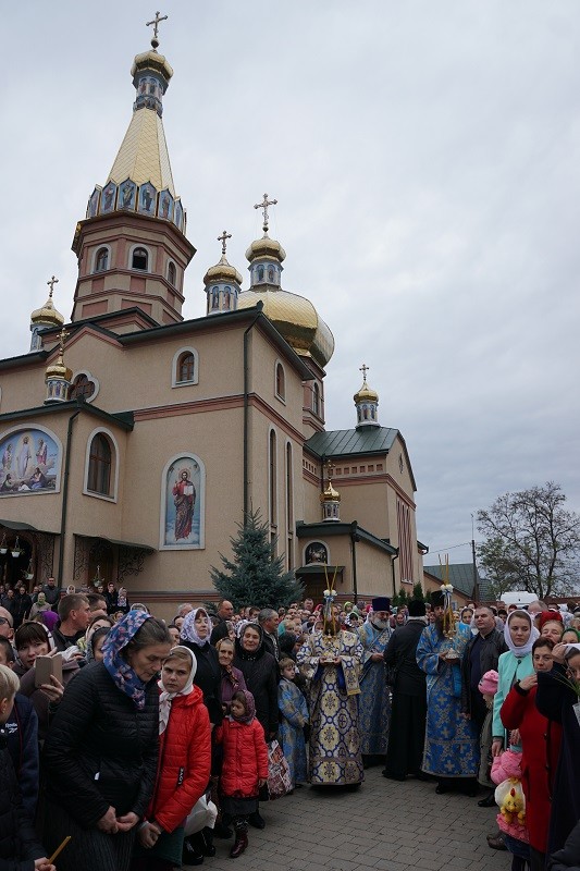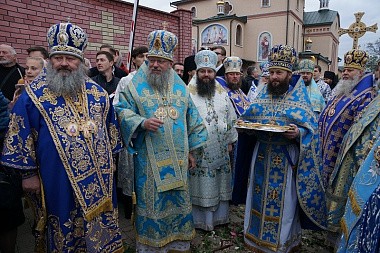 Перед Божественной литургией Предстоятель Украинской Православной Церкви совершил чин освящения новых монастырских храмов: церкви в честь Великомученика Георгия, а также храма в честь Преподобных отцов Оптинских и святителя Тихона, Патриарха Московского и всея Руси.