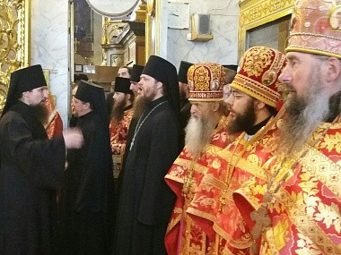 На малом входе Предстоятель Украинской Православной Церкви удостоил братию монастыря в священном сане богослужебных наград.