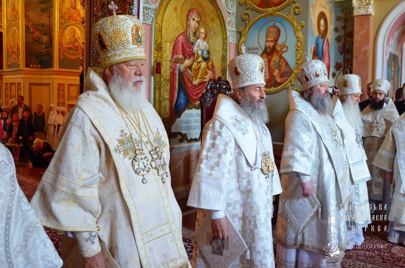 Предстоятелю Украинской Православной Церкви сослужил сонм архиереев: митрополиты Одесский и Измаильский Агафангел; Вышгородский и Чернобыльский Павел, наместник Успенской Киево-Печерской лавры; Белоцерковский и Богуславский Августин, Черниговский и Новгород-Северский Амвросий, Переяслав-Хмельницкий и Вишневский Александр; архиепископы – Белогородский Николай, Бучанский Пантелеимон, Запорожский и Мелитопольский Лука, Нежинский и Прилукский Ириней, Макаровский Иларий, Уманский и Звенигородский Пантелеимон, Яготинский Серафим, Ровеньковский и Свердловский Пантелеимон; епископы – Новомосковский Евлогий, Боярский Феодосий, Дионисий (Константинов), Конотопский и Глуховский Роман, Бородянский Варсонофий, Вознесенский и Первомайский Алексий, Шепетовский и Славутский Евсевий, а также братия и гости монастыря в священном сане.