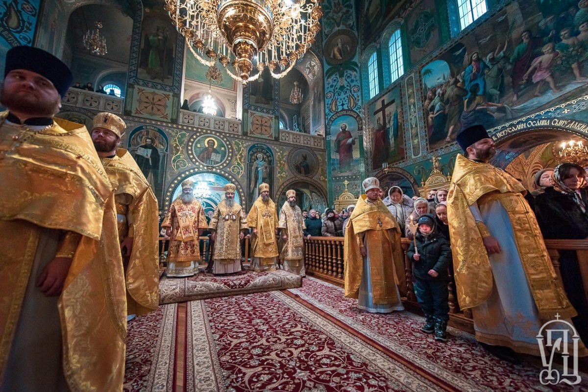 Предстоятелю Украинской Православной Церкви сослужили наместник Успенской Киево-Печерской лавры митрополит Вышгородский и Чернобыльский Павел, управляющий делами Украинской Православной Церкви митрополит Бориспольский и Броварской Антоний, архиепископ Фастовский Дамиан, епископ Вишневский Спиридон, епископ Бородянский Марк, духовенство монастыря и гости престольного праздника в священном сане.