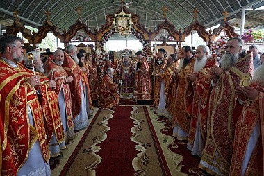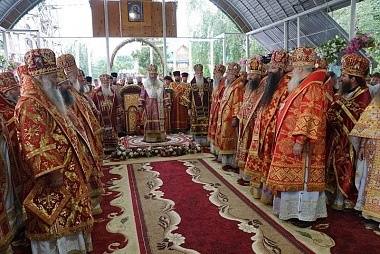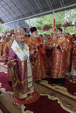 За Литургией Его Блаженству сослужили митрополит Хустский и Виноградовский Марк, митрополит Каменец-Подольский и Городокский Феодор, митрополит Вышгородский и Чернобыльский Павел, митрополит Тернопольский и Кременецкий Сергий, митрополит Могилев-Подольский и Шаргородский Агапит, митрополит Черновицкий и Буковинский Мелетий, архиепископ Ивано-Франковский и Коломыйский Серафим, архиепископ Банченский Лонгин, архиепископ Нежинский и Прилукский Климент, архиепископ Винницкий и Барский Варсонофий, епископ Шепетовский и Славутский Евсевий, епископ Хотинский Вениамин, гости праздника в священном сане и духовенство обители.