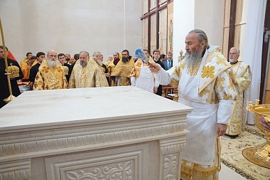 Его Блаженству сослужили митрополит Одесский и Измаильский Агафангел, митрополит Бориспольский и Броварской Антоний, митрополит Криворожский и Никопольский Ефрем, митрополит Елисаветградский и Новомиргородский Иоасаф, архиепископ Уманский и Звенигородский Пантелеимон, архиепископ Северодонецкий и Старобельский Никодим, епископ Фастовский Дамиан, епископ Южненский Диодор, наместник обители архимандрит Мануил (Заднепряный), духовенство монастыря и гости в священном сане.