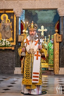 После чтения Святого Евангелия Предстоятель Украинской Православной Церкви обратился к многочисленной пастве с архипастырским словом, в котором рассказал о православном учении святителя Григория Паламы о нетварности Фаворского света, а также о подвиге преподобных отцов Печерских, которые отказались от земных благ для созерцания этого света. Блаженнейший владыка подчеркнул необходимость очищать свою душу от грехов через покаяние, пост и молитву для того, чтобы улучшить духовное зрение и увидеть Божественный свет.