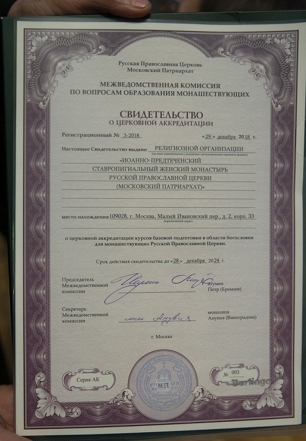 29 января 2019 года в завершение работы XIV направления «Древние монашеские традиции в условиях современности» ХХVII Международных Рождественских образовательных чтений, проходившего в Центре оперного пения им. Галины Вишневской г. Москвы, игумен Петр (Еремеев), председатель Межведомственной комиссии по вопросам образования монашествующих, наместник Высоко-Петровского ставропигиального мужского монастыря Москвы, вручил свидетельства о церковной аккредитации курсов базовой подготовки в области богословия для монашествующих Русской Православной Церкви и представления на право их реализации представителям 12-ти соискателей: