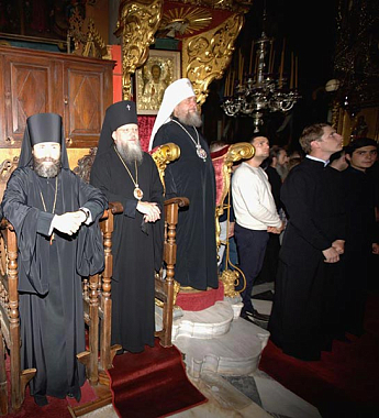 Богослужебные песнопения исполнили братский хор Пантелеимонова монастыря (регент – иеродиакон Садок) и сводный хор греческих монастырей Афона.