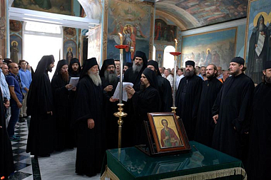 По окончании молебна митрополит Александр огласил текст поздравления Святейшего Патриарха Московского и всея Руси Кирилла с престольным праздником Русского на Афоне Пантелеимонова монастыря. Обращение Предстоятеля Русской Православной Церкви к монашествующим, ктиторам и паломникам обители прозвучало и на греческом языке.
