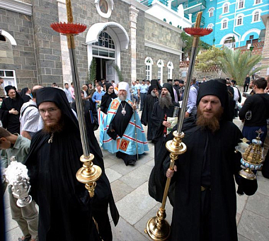 В завершение богослужения был совершен праздничный молебен и крестный ход с обнесением вокруг чествуемого храма главы великомученика Пантелеимона и иных святынь, хранящихся в обители.