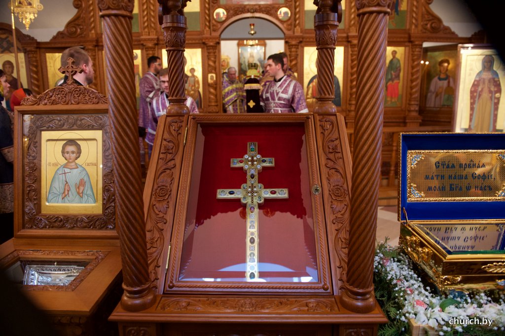 По окончании богослужения Патриарший экзарх совершил чин освящения креста – точной копии креста преподобной Евфросинии Полоцкой с частицами мощей святых угодников Божиих.