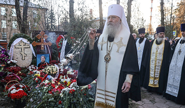 По окончании Литургии на месте упокоения почившего протоиерея Михаила Васильева у алтаря храма великомученицы Варвары и преподобного Илии Муромца митрополит Феогност отслужил панихиду и освятил коливо.