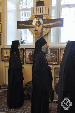 Затем процессия сестер и духовенства с пением тропаря, кондака и величания празднику проследовала в Казанский храм обители, где перед иконой Воздвижения Креста Господня была прочитана молитву празднику.
