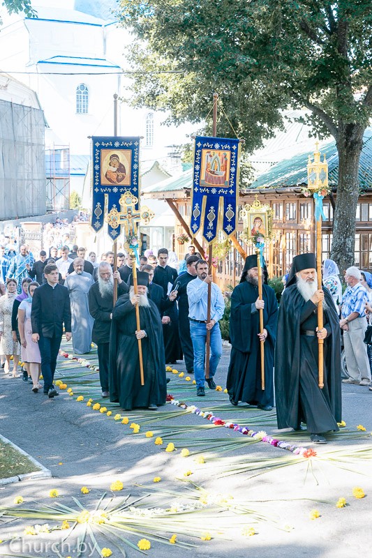 По окончании Литургии от Успенского собора был совершен крестный ход с плащаницей Божией Матери к храму Рождества Пресвятой Богородицы, именуемому Явленским, воздвигнутому на месте второго чудесного обретения Жировичской иконы Пресвятой Богородицы. Перед Явленским храмом был отслужен молебен с чтением акафиста Успению Пресвятой Богородицы.