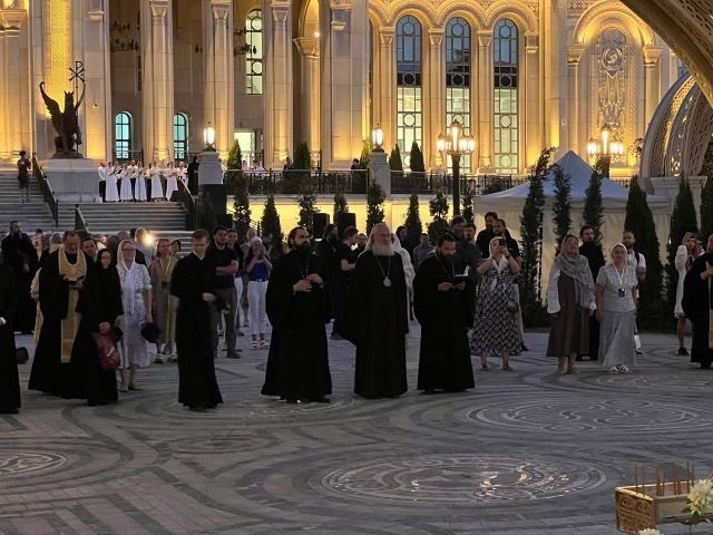Богослужение, которое началось на закате солнца, возглавил митрополит Наро-Фоминский Никандр, викарий Святейшего Патриарха Московского и всея Руси, постоянный член Священного Синода Русской Православной Церкви, председатель Финансово-хозяйственного управления Московской Патриархии.