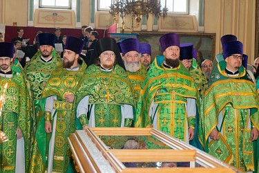 Особую торжественность моменту придало то, что накануне вечером в Барнаул из Орла на автотранспорте прибыла рака с мощами преподобного Макария, апостола Алтайского, основателя Алтайской духовной миссии.