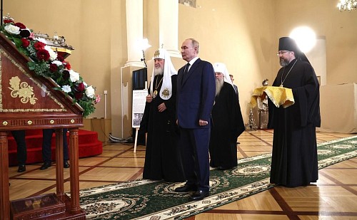 В верхнем храме, где в настоящее время пребывает историческая рака с мощами святого благоверного князя Александра Невского, глава государства и Святейший Владыка поклонились святым мощам.