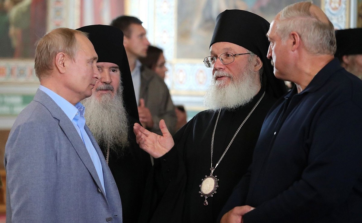 В.В. Путин и А.Г. Лукашенко осмотрели верхний и нижний храмы воссозданного собора Рождества Богородицы. Епископ Игнатий рассказал гостям об истории монастыря и его современной жизни, а также о торжествах по случаю 625-летия обители, которые завершились визитом Святейшего Патриарха Московского и всея Руси Кирилла 7 июля с.г.