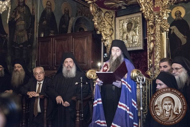 В составе кинотской Эпитропии в Русский монастырь прибыли антипросоп Великой Лавры иеромонах Никодим, антипросоп монастыря Ставроникита иеромонах Филимон, антипросоп монастыря Кутлумуш иеромонах Филофей, антипросоп монастыря Ксиропотам о. Павел, антипросоп монастыря Ксенофонт иеромонах Григорий и архиграмматеос (старший секретарь) Священного Кинота иеромонах Феофил. Также для участия в торжественной церемонии прибыли игумен Сербского монастыря Хиландар Мефодий и представители других обителей Афона: иеромонах Симеон Дионисиатский, иеромонах Георгий Ватопедский, иеромонах Димитрий Григориатский, иеромонах Тихон Симонопетрский, иеромонах Гавриил из скита Белозерка.