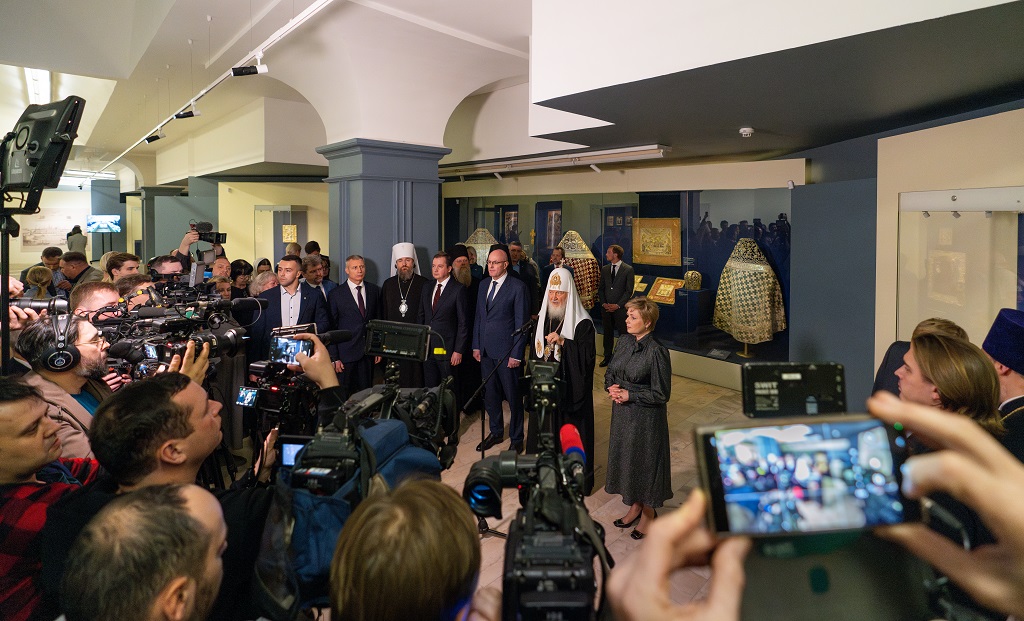 В ходе осмотра экспозиции, в которой представлены, в частности, произведения иконописи и декоративно-прикладного искусства XVI-XIX веков из фондов Музеев Московского Кремля, пояснения Его Святейшеству давала директор Музеев Московского Кремля Е.Ю. Гагарина.