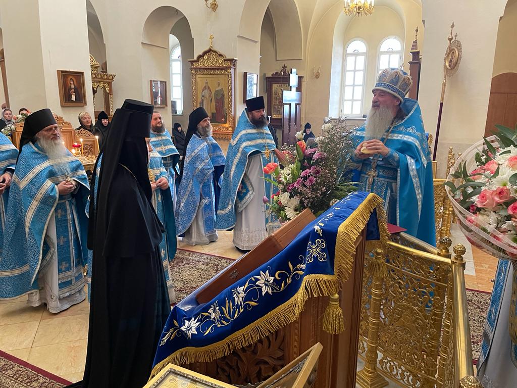 После отпуста духовенство совершило благодарственный молебен, затем архимандрит Александр обратился к настоятельнице Горненского монастыря игумении Екатерине со словами поздравления в честь ее тезоименитства и зачитал поздравительный адрес Святейшего Патриарха Московского и всея Руси Кирилла.