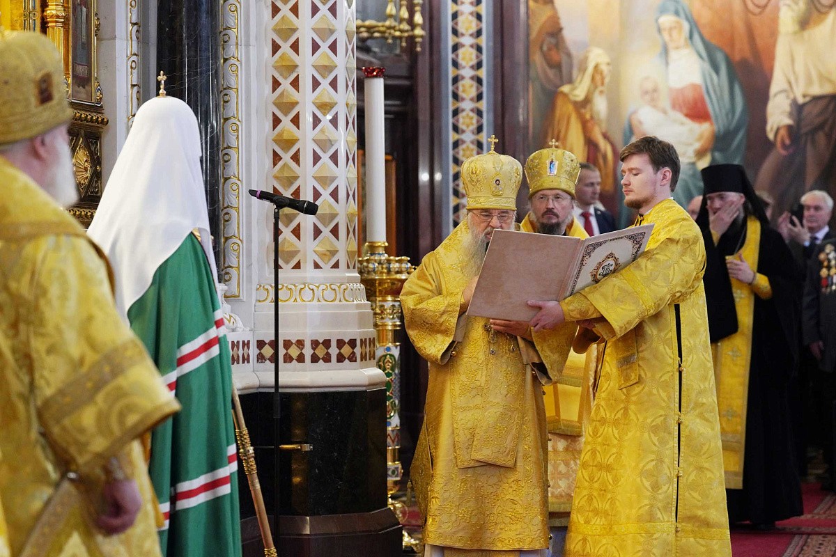 «Еще молимся Тебе, Господу Богу нашему, о еже услышатися гласу моления нашего, и молитве, и помиловати раба Твоего, ныне чествуемаго Святейшаго Патриарха Кирилла благодатию и щедротами Твоими, и исполнити вся прошения его, и простити ему вся согрешения вольная и невольная: благоприятным же быти мольбам и милостыням его пред престолом владычествия Твоего, и покрыти его от враг видимых и невидимых, от всякия напасти, беды и скорби, и недугов избавити, и подати здравие с долгоденствием: рцем вси, Господи, услыши и помилуй.