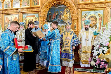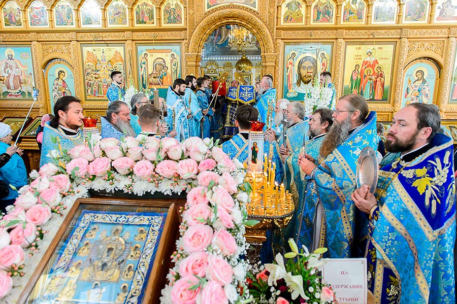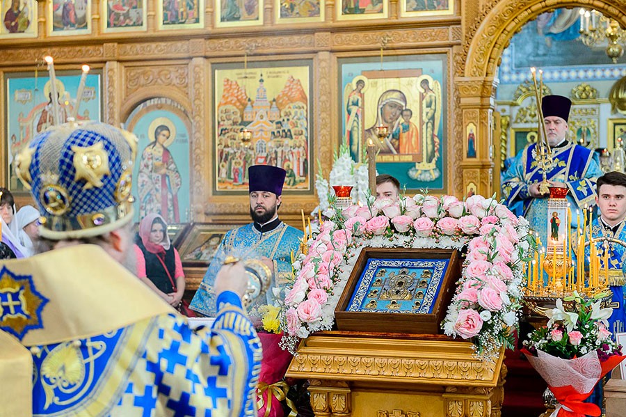 В завершение Литургии духовенство, хор и верующие совершили славление Пресвятой Богородице перед Ее чудотворным образом.