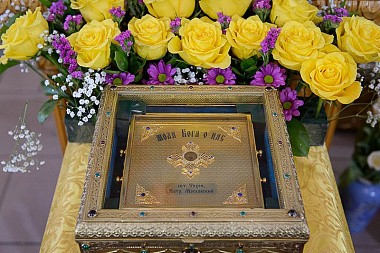 В завершение Литургии состоялось славление святителю Тихону, Патриарху Всероссийскому, перед ковчегом с частицей его честных мощей.
