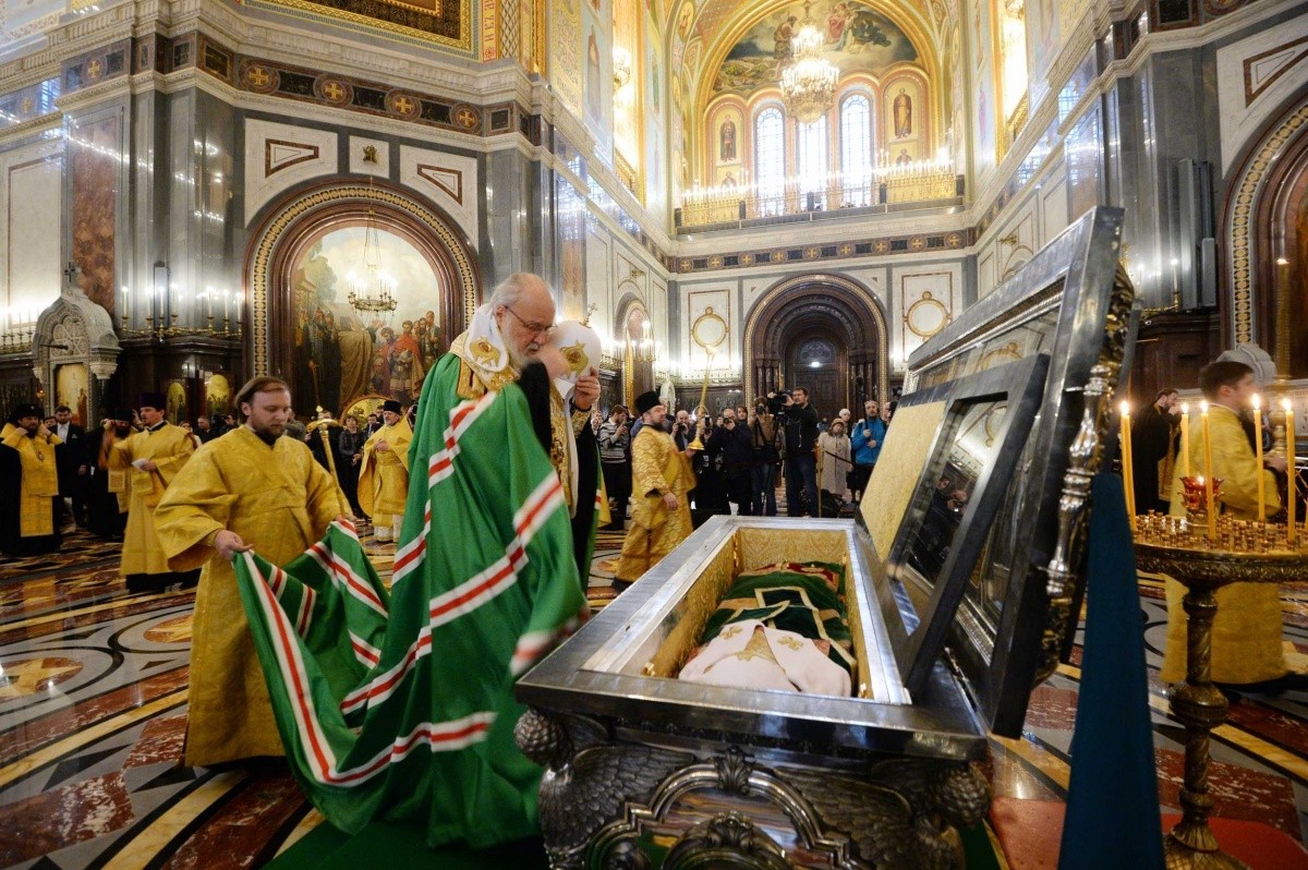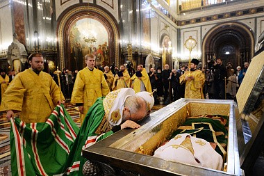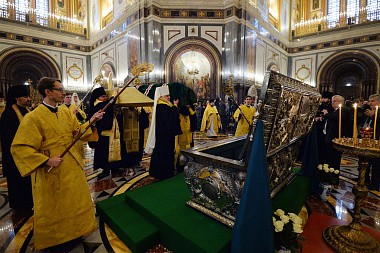 По окончании Литургии состоялась встреча честных мощей святителя Тихона, которые были принесены в Храм Христа Спасителя из Донского монастыря.