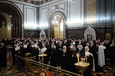 Молитвами святителя Тихона да вразумит, укрепит и оградит от всякого зла Господь Вседержитель епископат Церкви нашей, собравшийся на Архиерейском Соборе в преддверии столетия восстановления Патриаршества Русской Православной Церкви. Аминь».