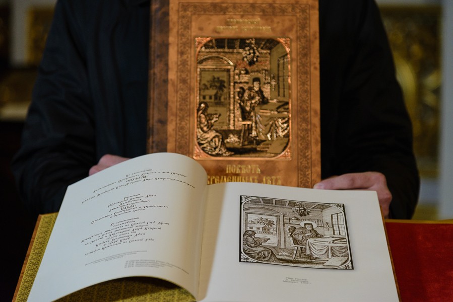 Книга, над созданием которой работала братия Лавры, украшена орнаментами и буквицами, воспроизведенными вручную. Набор текста осуществлялся вручную.