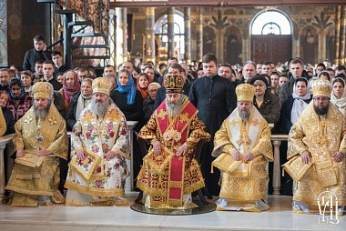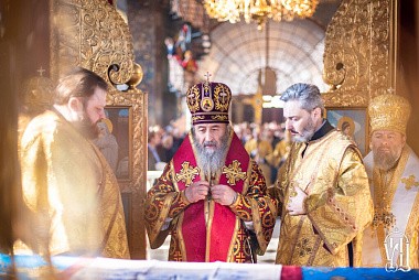 Его Блаженству сослужили наместник монастыря митрополит Вышгородский и Чернобыльский Павел, председатель Отдела внешних церковных связей митрополит Луганский и Алчевский Митрофан, архиепископ Бучанский Пантелеимон, епископ Белогородский Сильвестр и духовенство обители.