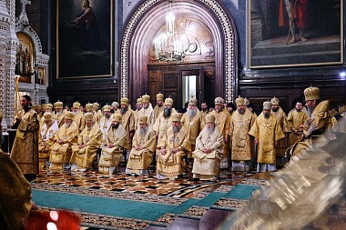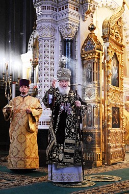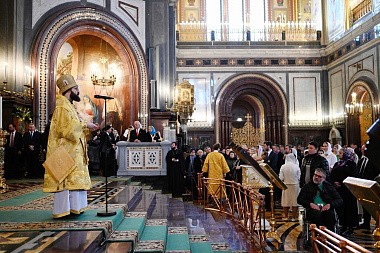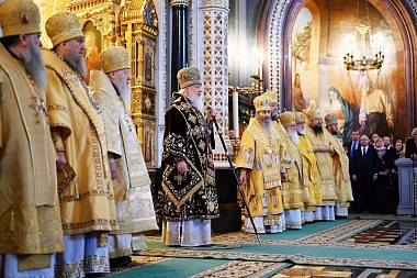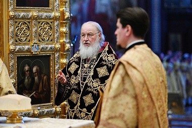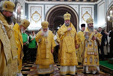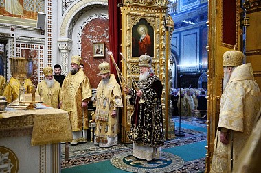 После сугубой ектении митрополит Крутицкий и Коломенский Ювеналий вознес молитву о Предстоятеле Русской Православной Церкви Святейшем Патриархе Московском и всея Руси Кирилле.