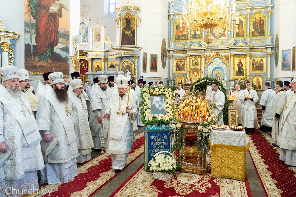 Митрополит Вениамин возглавил Божественную литургию в Успенском соборе Жировичской обители. Его Высокопреосвященству сослужили: митрополит Смоленский и Дорогобужский Исидор, архиепископ Витебский и Оршанский Димитрий, архиепископ Пинский и Лунинецкий Стефан, архиепископ Новогрудский и Слонимский Гурий, архиепископ Могилевский и Мстиславский Софроний, архиепископ Брестский и Кобринский Иоанн, архиепископ Гомельский и Жлобинский Стефан, архиепископ Гродненский и Волковысский Антоний, епископ Бобруйский и Быховский Серафим, епископ Туровский и Мозырский Леонид, епископ Молодечненский и Столбцовский Павел, епископ Лидский и Сморгонский Порфирий, епископ Полоцкий и Глубокский Игнатий, епископ Светлогорский Амвросий, благочинный 3-го Минского городского округа, настоятель Александро-Невского храма г. Минска протоиерей Николай Коржич, племянник митрополита Филарета протоиерей Георгий Вахромеев и духовенство Белорусского экзархата. Диаконский чин возглавил протодиакон Николай Авсиевич.
