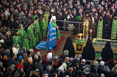 По окончании Литургии был совершен молебен преподобному Амфилохию и состоялся крестный ход с его честными мощами в пещерный храм.