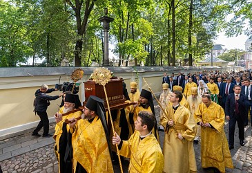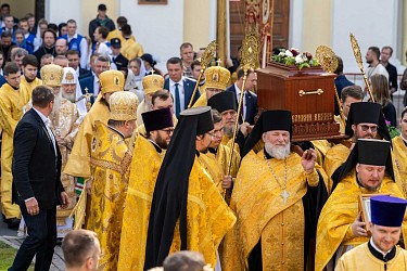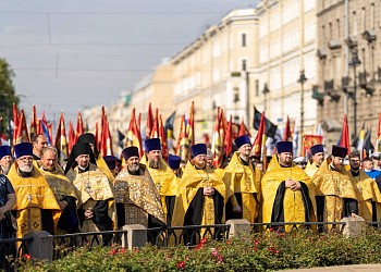 По окончании Литургии Предстоятель Русской Православной Церкви возглавил крестный ход c мощами благоверного князя Александра Невского из Благовещенского храма на площадь Александра Невского.