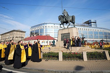 По прибытии крестного хода из Благовещенского храма честные мощи святого князя были установлены на специальном помосте с сенью.